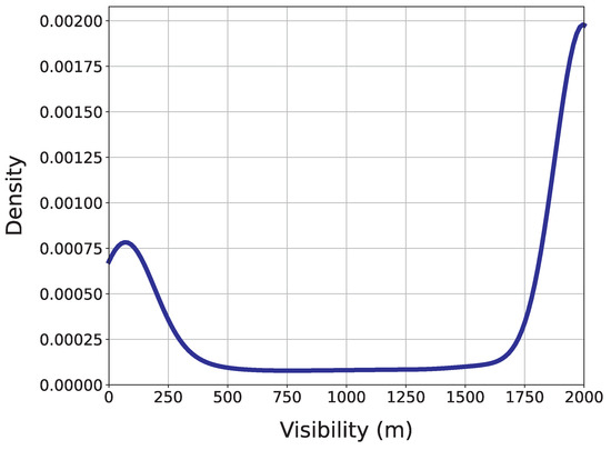 The data were acquired with a Biral WS-100 visibility sensor, which operates between 0 to 2000 m. The location of Mondoñedo is 140 m above sea level, and the distance to the sea is around 20 km; all the variables were acquired at 2 m height from the ground. Figure 5 illustrates the first 500 samples of the visibility time series, where the tendency of the data to remain close to 2000 or to 0 can be observed, while there are few data in intermediate ranges. This is further illustrated by plotting the density function of the data (Figure 6), where two peaks may be found: one near 0 m, corresponding to very low visibility levels, and a much more prominent peak near 2000 m, corresponding to events where visibility is very good.