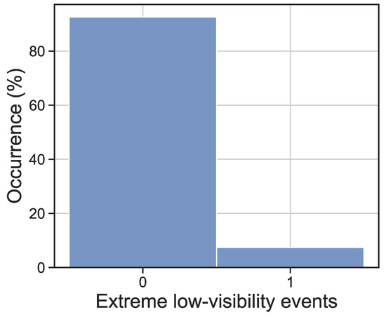 Class distribution of the visibility data, where 0 represents no extreme events and 1 denotes the extreme samples.