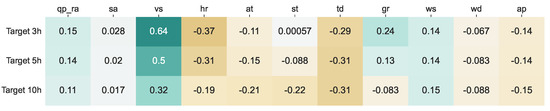 Correlation matrix between target and predictive variables for each time prediction horizon.