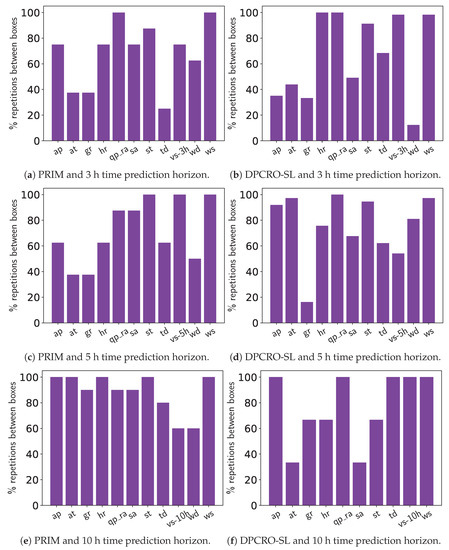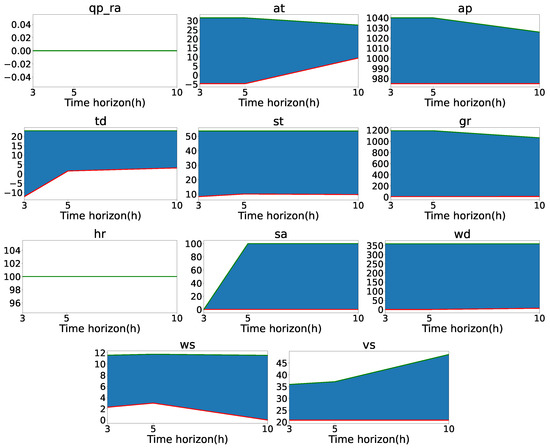 This work is focused on extreme low-visibility events, i.e., those fog events leading to visibility values below 40 m, which are those affecting the normal motor-road circulation the most. Since the problem is approached as a binary classification problem, Figure 7 shows the distribution of samples for each class, where extreme low-visibility events (class 1) account for 7.41% of the total number of samples. Thus, we focus on developing inductive and evolutionary rules for detecting and describing these specific events. The predictive variables used in this study for dealing with extreme low-visibility events consist of 11 exogenous meteorological variables registered by the same weather station at Mondoñedo (Table 1). A brief discussion on the predictive variables is worthy here. Note that we used all the variables available (measured) in the Mondoñedo weather station; we did not carry out a previous step of feature selection, so we trust that the proposed algorithms are able to deal with possible redundancy between predicted variables, extracting the useful information from them in terms of their contribution to the visibility prediction. In addition, note that some of them are not related to visibility, but they are measured for other reasons, such as for the care of the road. For example, salinity of water in air is a variable related to corrosion of elements in the road, but it does not seem to be fully related to orographic fog. Similarly, accumulated precipitation (during the last hour) and ground temperature do not have much relation with the fog formation mechanism, but they can be involved in its persistence. The time horizons of the visibility forecast were established in +3 h, +5 h, and +10 h; therefore, measured variables acquired from (or ranging from to in the case of DL methods) are used as predictors to forecast visibility at , , and . In order to obtain an idea of the importance of the predictive variables, the Pearson correlation coefficient among the predictive variables and the target variable (prior to its binarization) is presented in Figure 8 for the three prediction time horizons considered. It can be seen how for some variables (qp_ra, sa, td, ws, ap) the correlation remains constant as the prediction horizon increases, while for others (vs, hr, at, st, gr, wd) the correlation varies. The variables showing the highest correlation are visibility in previous hours, the relative humidity, and the dew temperature. On the contrary, there are some other variables, such as salinity of water in air or ground temperature, which do not have, as expected, a high correlation with visibility prediction.
