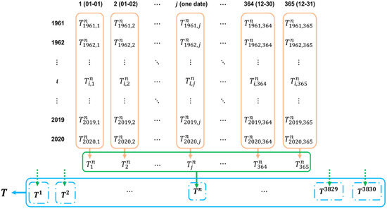 The set in the module highlighted in green is used to calculate the 90th percentile of the maximum temperature at one grid point. The set in the module highlighted in orange is used to calculate the anomaly and standard deviation of maximum temperatures at one grid point on one calendar day. It can be easily understood that we set 3830 different thresholds for PTM and 3830 × 365 = 1,397,950 different thresholds for FATM or VATM.