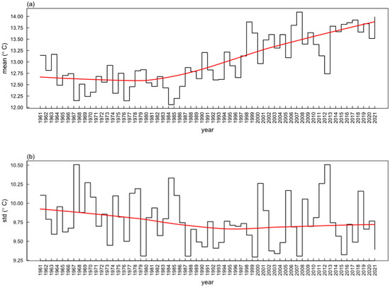Histogram of the mean and standard deviation of the daily maximum temperature series for all grid points from 1961 to 2021 and its LOWESS trend fitting line. (a) Shows the mean of the daily maximum temperature series for all grid points from 1961 to 2021, and (b) Shows the standard deviation of the daily maximum temperature series for all grid points from 1961 to 2021.