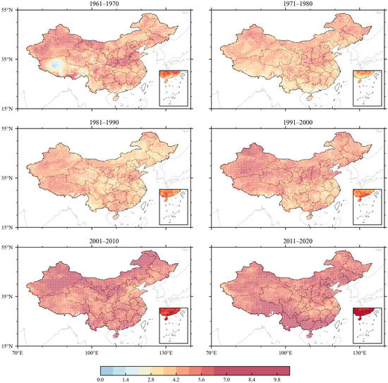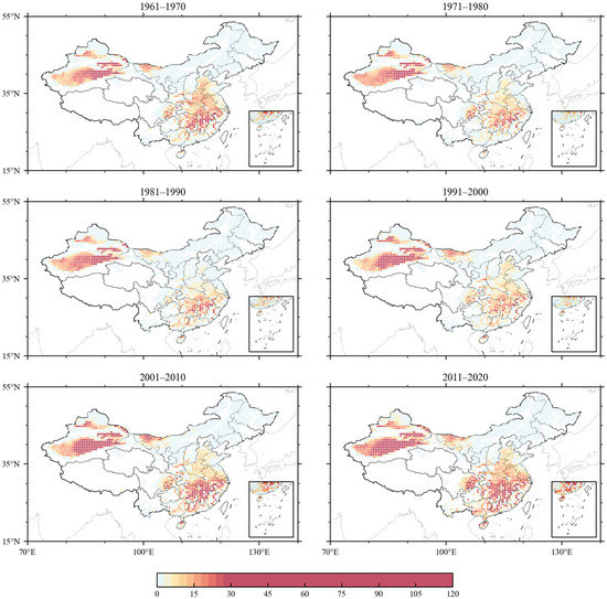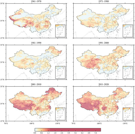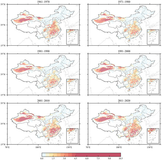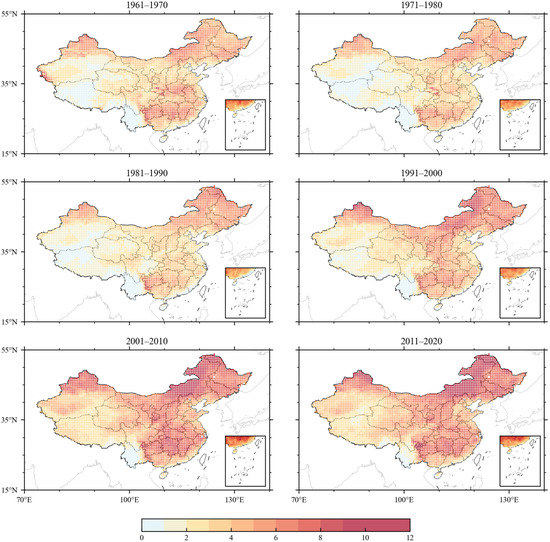 Figure 3 shows the distribution of the average occurrence times of heat wave years when screened by the absolute method. In terms of the occurrence region of heat waves, the common characteristics of the frequency of the heat wave in the six decades are as follows. The frequency of heat waves in the middle and lower reaches of the Yangtze River, Jianghuai region, and Xinjiang is significantly more than that in other regions of China. Northeast China and Inner Mongolia experience heat waves, but less frequently. Tibet and Qinghai hardly experience heat waves. In terms of spatial and temporal variations in heat waves, the frequency and spatial range of heat waves in the 1970s decreased compared with that in the 1960s and then reached the bottom in the 1980s. It began to increase in the 1990s and zoomed in frequency and spatial range after the 21st century.