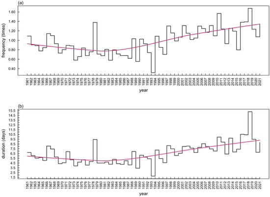 Based on the absolute method, the histogram of occurrence times and duration days of heat waves at each grid and the fitting line of the LOWESS trend were obtained. (a) Shows the average occurrence times of heat waves/number of grid points in each year from 1961 to 2021. (b) Shows the average number of days per grid point of heat waves in each year from 1961 to 2021.