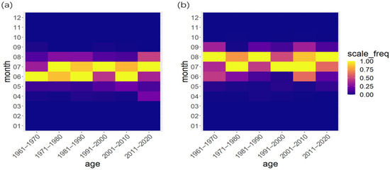 The distribution diagram of the earliest occurrence date and the latest extinction date of heat waves based on the absolute method. (a) Shows the distribution of the earliest occurrence date of heat waves in each month for each decade, and (b) Dhows the distribution of the latest extinction date of heat waves in each month for each decade.