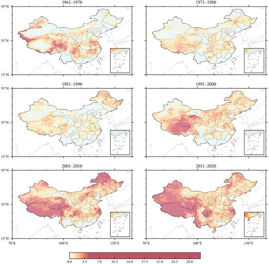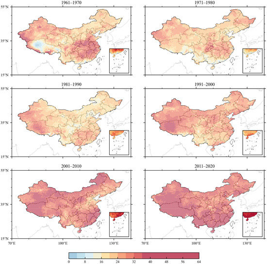 Figure 7 depicts the decadal mean frequency distribution of heat waves screened using PTM (three consecutive days with maximum temperatures at least above the 90th percentile of the temperature series). Figure 8 depicts the corresponding average decadal duration of the selected heat waves. According to the results obtained by the relative method, almost all grid points have more than two times the amount of heat waves, and the duration of heat waves is more than 12 days, except for the Tibetan Plateau region in the 1960s. The average frequency and average duration of heat waves in the decadal period decreased first and then increased. The average frequency and average duration of decadal heat waves decreased from 1971 to 1980 and 1981 to 1990, began to rise from 1991 to 2000 and increased significantly from 2001 to 2010 and 2011 to 2020.