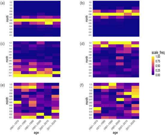 The distribution of the earliest occurrence date and the latest extinction date of heat waves were obtained based on the relative method. (a) and (b), respectively, show the distribution of the earliest occurrence date and the latest extinction date of heat waves in each month obtained by PTM. (c) and (d), respectively, show the distribution of the earliest occurrence date and the latest extinction date of heat waves in each month obtained by FATM. (e) and (f), respectively, show the distribution of the earliest occurrence date and the latest extinction date of heat waves in each month obtained by VATM.