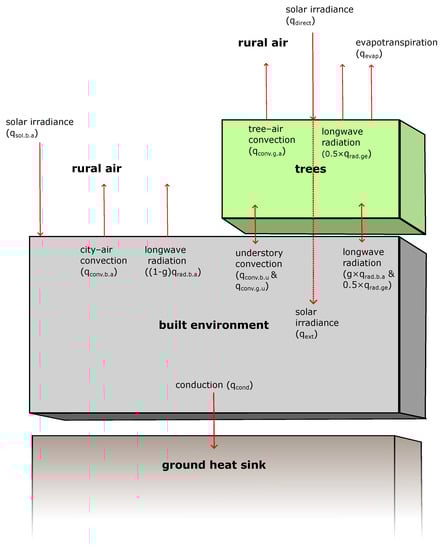 Model structure showing heat fluxes among city, trees, rural air, and ground.