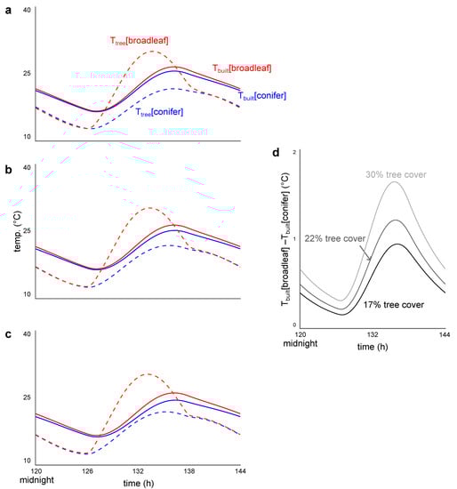 At 17% tree cover, the maximum temperature of the built environment was 1.0 °C warmer when it was forested by conifers than by broadleaf trees (Figure 3a). When tree cover increased to 22%, the temperature differential increased to 1.2 °C (Figure 3b); when tree cover increased to 30%, conifers were 1.7 °C cooler (Figure 3c).