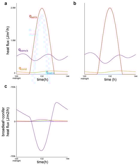 Solar radiation and convection dominated heat fluxes into and out of the built environment (Figure 4). Solar radiation was slightly higher in the broadleaf-forested built environment (because ), and the convection heat flux was higher at night (Figure 4). Conduction also played an important role, but longwave radiation was negligible (Figure 4).