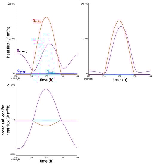 Similarly, solar radiation and convection dominated the heat fluxes into and out of the urban forests, though convection curves were shaped quite differently across the urban forest types (Figure 5). Broadleaf forests showed a single large diurnal flux of convection, while coniferous forests also showed a smaller diurnal flux and a substantial nocturnal flux. Evapotranspiration was significant in the coniferous forest, but small in the broadleaf forest (Figure 6). Longwave radiation was insignificant in both forest types (Figure 5).