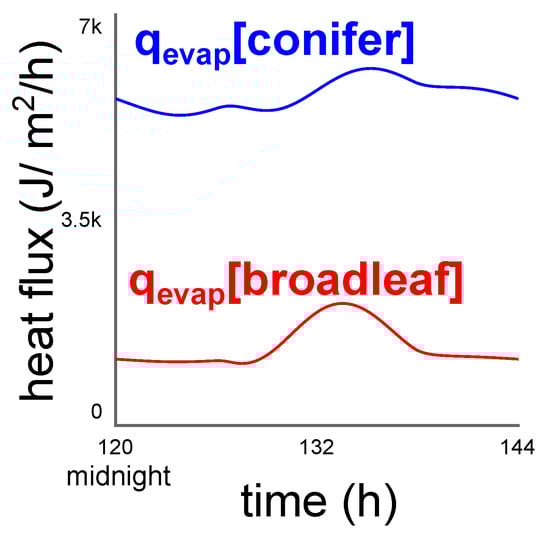 The three-fold greater evapotranspiration exhibited by conifers (Figure 6) is consistent with observational evidence [], and confirms hypotheses that heightened evapotranspiration may lower conifer foliage surface temperature []. Moreover, the higher diurnal broadleaf tree convection suggests that, relative to conifers, broadleaf trees may warm pedestrians more and offer less respite from heat waves. When choosing to reforest or afforest cities, tree type matters.
