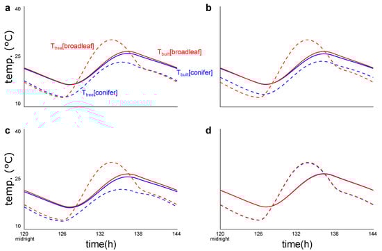 Sensitivity analysis results showing built environment temperatures (solid lines) and tree temperatures (dashed lines) when (a) the conifer leaf area index (LAI) is set equal to that of broadleaf trees ( (conifer) (broadleaf)), (b) conifer leaf boundary layer resistances are set equal to those of broadleaf leaves ( and ), (c) conifer dry leaf mass per unit leaf area was set equal to that of broadleaf trees (), and (d) when conifer values for all three variables (leaf area index, boundary layer resistance, dry leaf mass) were set equal to the broadleaf values. All plots are for 17% tree cover.