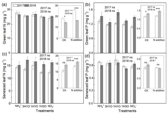 Response of leaf nutrient concentrations (including green leaf N (a) and P (b), senesced leaf N (c) and P (d)) to various N fertilization forms. The asterisks and ns above the white and gray bar graphs represent the significance between 2017 and 2018. The asterisks and ns following the number of years inside the little figure represent the significance in control (n = 4) and N addition (average, n = 20). The asterisks and ns following the number of years outside the figure represent the significance in N addition groups. * p < 0.05; *** p < 0.001; ns, not significant.