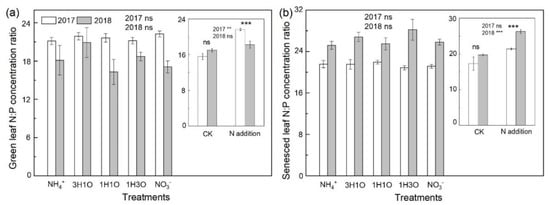 Response of ratios of N:P in green (a) and senesced leaf (b) to various N form fertilizations. The asterisks and ns above the white and gray bar graphs represent the significance between 2017 and 2018. The asterisks and ns following the number of years inside the little figure represent the significance in control (n = 4) and N addition (average, n = 20). The asterisks and ns following the number of years outside the figure represent the significance in N addition groups. ** p < 0.01; *** p < 0.001; ns, not significant.