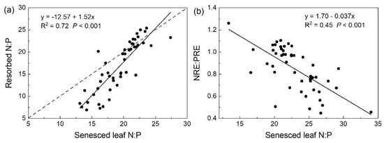 Relationship between senesced leaf N:P ratios and resorbed N:P ratios (a) and NRE:PRE ratios (b). The dash line represents the 1:1 line.