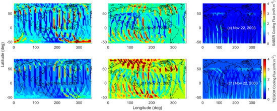 where ko (=4.2 × 10−11 cm3 s−1 [25]) and ko2 (=2.4 × 10−14 cm3 s−1 [26]) are, respectively, the relaxation rates of energy transition from NO(v = 1) to NO(v = o) in collision with atomic and molecular oxygen density, and [O], [O2], and [NO] represent the number densities of O, O2, and NO, respectively. A10 is the Einstein’s coefficient (=13.3 s−1), h is Planck’s constant, v is frequency of NO emission, K is Boltzmann constant, and T is the neutral temperature. The TIEGCM simulated nitric oxide cooling has been investigated by many researchers [27,28,29,30,31,32,33,34]. In the present study, the TIEGCM data are sampled at the TIMED/SABER satellite measurement locations and binned into same latitude–longitude grid as SABER. A comparison between the TIMED-SABER satellite measurement and the TIEGCM simulation results during the super storm event of November 2003 is shown in Figure 1. It is clearly evident that the TIEGCM simulation result overestimates the NO cooling flux during the storm period. Similar storm-time overestimation of TIEGCM simulation during moderate and intense storms has been reported by many researchers [26,28,29,31,32,33,34].