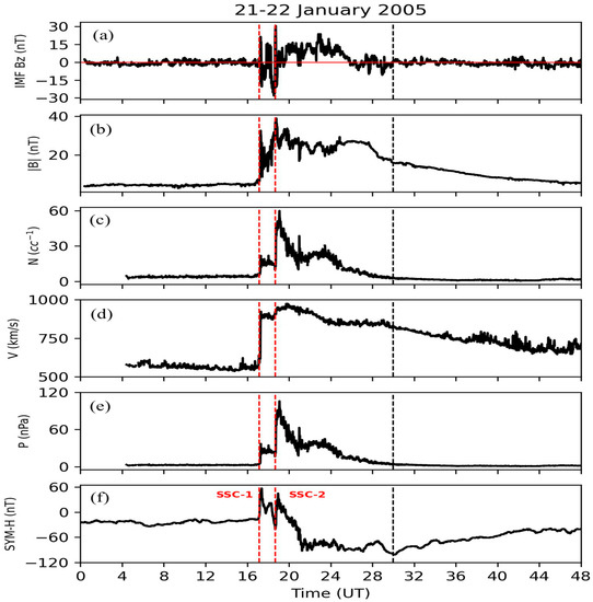 The CME that erupted on 20 January 2005, from the X7.1/3B solar flare caused a moderate geomagnetic storm on 21 January 2005 [42,43]. Figure 2 shows the solar wind parameters at the L1 point (in geocentric solar magnetospheric coordinate system) as measured by the ACE satellite. These have been shifted by 24 mins to align with the geomagnetic signatures of the first sudden storm commencement (SSC). This storm was characterized mainly by two storm commencements (indicated as SSC-1 and SSC-2 in red dashed lines) associated with two consecutive interplanetary shocks. The ACE satellite detected a large coronal mass ejection (CME) at ∼16:48 UT that arrived at the magnetopause at ∼17:12 UT on 21 January triggering SSC-1, and a few minutes later (at 18:43 UT) another CME shock front arrived that triggered SSC-2. It can be seen that the solar wind parameters (|B|, solar wind density, and velocity) changed sharply at these times. The proton density Np increased from 2 cc−1 to 22 cc−1 during SSC-1 and further increased to an unusually high value of 62 cc−1. The solar wind velocity increased from 565 km/s to 900 km/s. The solar wind dynamic pressure increased from 2 nPa to 35 nPa during the SSC-1, and then it increased to the significantly high value of 106 nPa during SSC-2. In response to SSC-1, the SYM-H increased from −17 nT to 55 nT. A few minutes later (at 18:43 UT), the second shock front arrived, causing the SSC-2 that led to a second increase in the SYM-H value. It is around this time that the IMF Bz turned northward, but surprisingly, the storm’s main phase continued to develop. The SYM-H reached its lowest value of −105 nT at 06:00 UT on 22 January. The IMF Bz was continuously northward from 19:40 UT, 21 January to 02:45 UT, 22 January 2005. Typically, when the IMF Bz turns northward, the ring current starts to recover. But surprisingly, in this case, the ring current grew under the IMF Bz condition for more than 10 h. This apparently “anomalous” behavior was first reported by Du et al. (2008) [3].