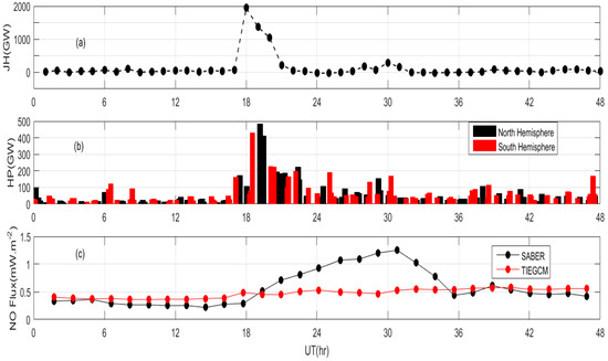Figure 3 depicts the (a) Joule heating power, (b) hemispheric power, and the (c) orbital averaged NO cooling flux during the 21–22 January 2005, storm event. The Joule heating power is calculated using an empirical formulation by Knipp et al. (2004) [44]: JH(GW) = 13.36 pc + 5.08 pc2 + 0.47 Dst + 0.0011 Dst2, where pc and Dst are, respectively, the polar cap index and Dst index. We used 1-hour data of the polar cap over Thule and Dst index obtained via OMNI database. The storm started at approximately 17:12 UT on 21 January 2005. Consequently, the Joule heating power increased drastically in response to the energy deposition, reaching a maximum value of approximately 1957 GW at approximately 18 UT. The NOAA satellite observations of the hemispheric power also exhibited similar strong enhancement in both the hemispheres. The TIEGCM simulation slightly overestimated the NO cooling emission during magnetically quiet period, i.e., time period before onset of the storm. The quiet-time values are, respectively, approximately 0.28 mW.m−2 and 0.39 mW.m−2 for SABER and the TIEGCM simulation. However, a quite surprising result, between the TIMED-SABER observations and TIEGCM model simulations was observed during the geomagnetic storm period. The TIEGCM results showed an average increment of approximately 25%, reaching the average value of approximately 0.5 mW.m−2. On the other hand, a remarkable elevation of NO cooling flux was observed in the measurement. The NO cooling flux increased by approximately four times the pre-storm value, reaching the maximum value of approximately 1.3 mW.m−2 at approximately 7 UT on 22 January 2005, approximately 12 h of post maximum enhancement in Joule heating. As the storm receded, the SABER observations of the cooling flux returned to the pre-storm value. The cooling flux also showed variation similar to that during the pre-storm period. This suggests that the TIEGCM simulation results severely underestimated the NO cooling flux during this storm event.