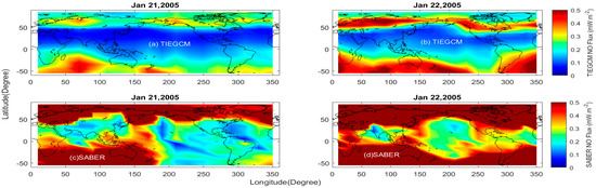Latitude–longitude cross-section of nitric oxide flux from (a,b) the TIEGCM simulation and (c,d) TIMED-SABER satellite observation.
