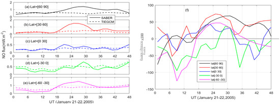 We also studied the latitudinal variation of NO cooling flux during this event by using both model and observation, as shown in Figure 6. We separated the latitudes into 30° bins. The dashed and the solid lines, respectively, represent the model simulation and observation results. The model result matches very well with the observation in the north hemisphere before the storm’s onset. On the other hand, it shows a relatively higher value than the observation in the southern hemisphere. As the storm arrives, the TIEGCM shows slight enhancement particularly in the latitude above ±60°, with maximum increase observed in the southern hemisphere. The TIEGCM does not show any significant variation in the latitude of 60–90°. However, a drastic increase is noticed in the TIMED-SABER satellite observations in all the latitude sectors. The relative change (%) in the latitudinal variation of NO cooling flux between model and observation is shown in Figure 6f. The relative increase in observed cooling flux is higher in the high latitude. The maximum relative enhancement is observed within 18 h of the onset. Further, the maximum enhancement of approximately 70% is observed in the 30–60° latitude region in the northern hemisphere. The enhanced flux sustains longer in the high latitude region as compared with the low latitudes.