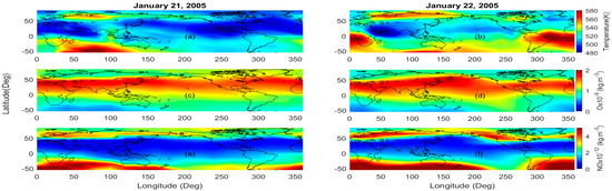 The cooling emission is very sensitive to the temperature variation due to the exponential dependence [10,17]. We investigate the TIEGCM-model-calculated atomic oxygen, nitric oxide, and temperature variation to understand the extreme underestimation during this event. Figure 7a–f depict the TIEGCM simulated latitude–longitude cross-sections of the thermospheric temperature and densities of atomic oxygen and NO along the satellite orbit corresponding to the altitude of 130 km. The thermospheric temperature during 21 January 2005, and January 22, 2005, are, respectively, shown in Figure 7a,b. A global increase in the temperature structure can be observed during 22 January 2005, except near the 50–100° longitude region in the latitude of ± 50°. Equation (3) has only an exponential temperature dependence term. Other reaction rate coefficients are independent of temperature. It is to be noted that Sheng et al. (2017) [32] reported that the use of a temperature-dependent chemical reaction (in )