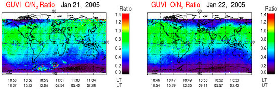 GUVI observations of O/N2 ratio during 21–22 January 2005.