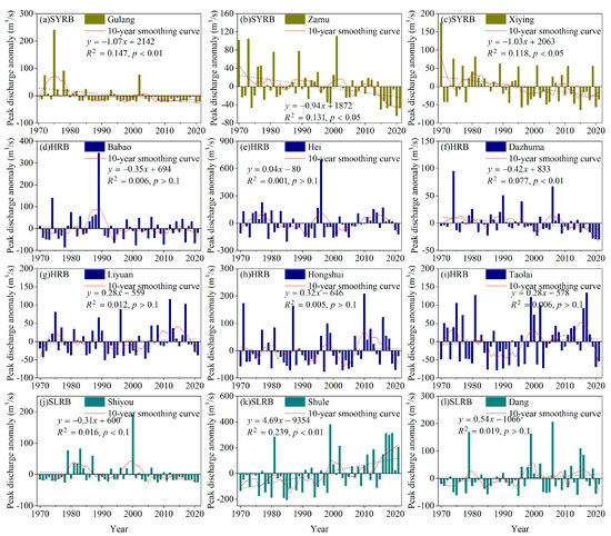 The twelve rivers, that originate at high-altitude in the QMs, are mainly recharged by precipitation, snow, and glacial meltwater and have specific, typical flood generation mechanisms. Heavy precipitation and the melting of snow and ice water, due to increased temperatures, are the main factors in flood generation. As a result, the magnitude of floods has fluctuated over the 50 years of observation, but the structure is stable. The results of the SQ-MK test for twelve representative rivers are shown in Figure 3. Six of the twelve rivers exceeded the critical value of 1.96, for which α = 0.05 in the significance test. Thus, the AMPD series showed abrupt changes. Among them, in the eastern region of QMs, the SQ-MK test values of the Gulang and Xiying rivers continued to decrease and break the critical values during the period 1970–2021, but the SQ-MK test values of the Zamu River fluctuated steadily. In the central region, the change points of the Babao and Dazhuma rivers occurred in 1989 and 2020, with the significance level of 95%. However, the Hei, Liyuan, Hongshui, and Taolai rivers all showed stable fluctuation from 1970 to 2021, without breaking the critical values. In the western region of the QMs, the SQ-MK test values of the Shiyou, Shule, and Dang rivers behaved differently. Shiyou River showed an increasing trend from 1970 to 1984 and broke the critical value in 1983, followed by a continuous decreasing trend from 1985–2021. Though it had a decreasing trend from 1970 to 1986, Shule River showed a continuously increasing trend after 1987, bypassing the critical value of 1.96, to a value of 3.47. From 1970 to 2021, Dang River did not break through the critical value and presented a slightly increasing trend. In Figure 3, most of the change points can be seen after the mid-1990s, whereas significant trends occurred in SYRB (a and c), HRB (f), and SLRB (k).