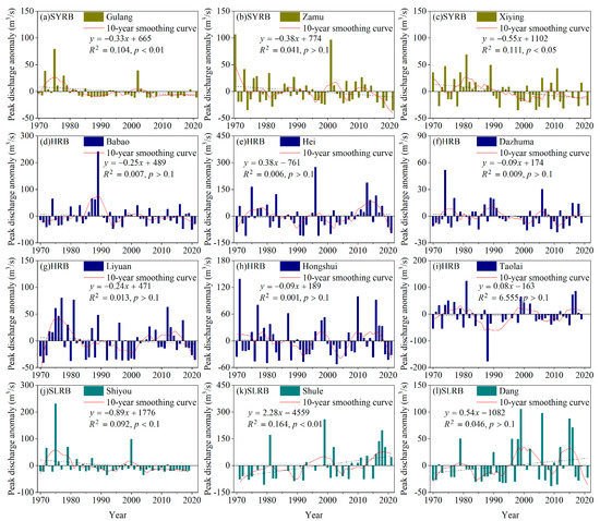 Trends of POT3M flood series for 12 representative rivers in the QM region, northwest China. (a–c) Denote Gulang, Zamu, and Xiying rivers in SYRB, (d–i) denote Babao, Hei, Dazhuma, Liyuan, Hongshui, and Taolai rivers in HRB, (j–l) denote Shiyou, Shule, and Dang rivers in SLRB, respectively.
