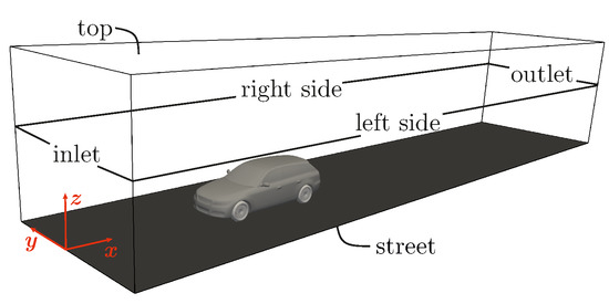 At the inlet, Dirichlet boundary conditions (BCs) for velocity, species, temperature and turbulent variables are applied. Inlet velocity points, species mass fractions and temperature are set to atmospheric conditions and the turbulent variables k and are based on a turbulence intensity of 1% and an eddy-viscosity ratio of . Therefore, where is the face value of the above mentioned flow and turbulent variables and the respective reference value. Regarding the pressure, Neumann BCs (i.e., where is the pressure in this case and is the boundary face normal vector) are applied at all boundaries except at the outlet, where the atmospheric pressure is prescribed. For all other variables Neumann BCs are employed. Slip BCs (, where ⊥ is the normal component) are used for the velocity at the right/left sides and at the top. Regarding k and , wall functions are applied at every solid wall (street, vehicle and wheels) whereas Neumann BCs are used for the outer boundaries (right/left side, top). Additionally, Neumann BCs are considered for species mass fractions and temperature. At the vehicle surface no-slip ( m/s) conditions are used whereas the street has the same stream-wise velocity as the inlet ( m/s) such that the movement of the vehicle relative to the street is captured correctly. The wheels have a rotational velocity obeying the aforementioned velocity of the street and radius r of the wheel, i.e., .
