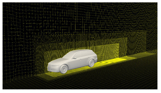 The computational domain shown in Figure 1 is created to simulate the flow around the vehicle and, in particular, the dispersion of pollutants in the vehicle wake. A total size of (35, 16, 8) m is selected. In order to simulate the flow around a vehicle in an open-road environment, an even bigger domain, as also suggested by [27], could be used. However, these dimensions have been proven appropriate, while the lateral boundary conditions are showing a small influence on the flow. In fact, enlarging the domain just produced a higher number of cells but showed an insignificant deviation from results obtained with smaller dimensions. For instance, the cut plane concentration integrals downstream the vehicle, as discussed in Section 2.5 deviated less than 2%. The computational cost, however, increased by more than 27%.