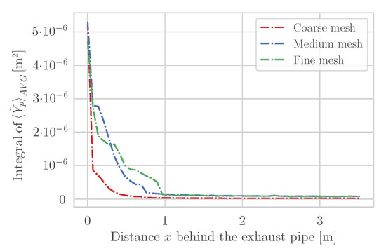 Mesh independence is of major concern in CFD. Therefore, three different meshes were tested under the same conditions. URANS simulations were performed till the residuals of the time-averaged pollutant mass fraction () dropped below . The integrals of pollutant mass fraction in the -planes downstream the tailpipe exit are compared in Figure 3 (see also Equation (19)). Here, the pollutant is averaged over 20 periods to account for the time-dependent vortex shedding.