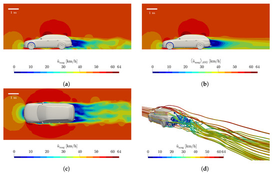 Velocity magnitude of a vehicle at 50 km/h. (a) Instantaneous velocity magnitude at -plane (tailpipe position), (b) Time-averaged velocity magnitude at -plane (tailpipe position), (c) Instantaneous velocity magnitude at -plane (tailpipe height), (d) Streamlines colored by the velocity magnitude.