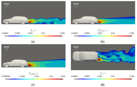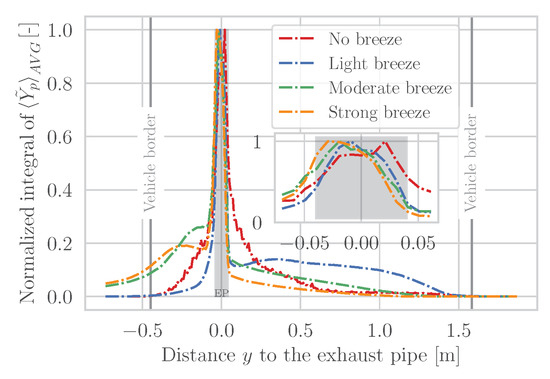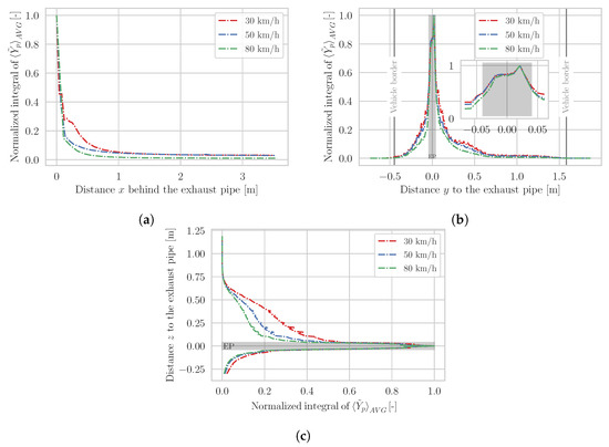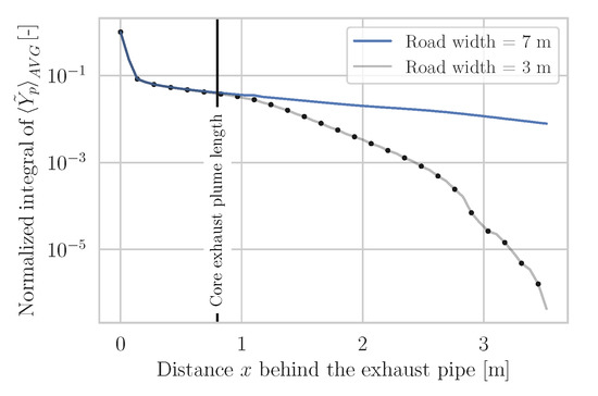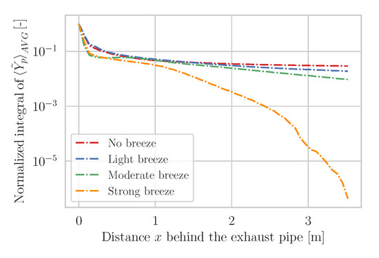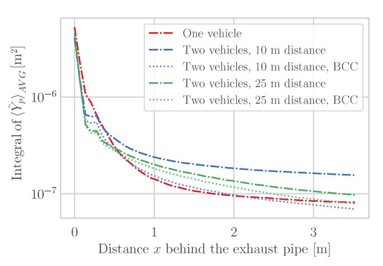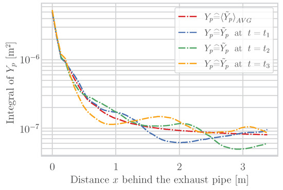In Section 3, the cut plane concentration integrals in the -planes, -planes and -planes with the respective distance to the exhaust tailpipe are analyzed, which would in case of time-averaged pollutant mass fraction read