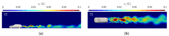 The recirculation zone behind the vehicle is confined to the near wake and is in the order of magnitude of a vehicle length. This region is of particular importance, since the convective flow velocity tends to zero toward the center of the recirculation zone and, in particular, turbulent velocity fluctuations increase compared to the free-stream region. Consequently, Reynolds stresses are increased in this region, which enhances turbulent mixing. Based on the modeling assumptions made, this is summarized by the eddy viscosity. As can be seen in Figure 6, this is at a maximum of in the wake of the vehicle. In contrast, the kinematic viscosity is 1.55 m/s.