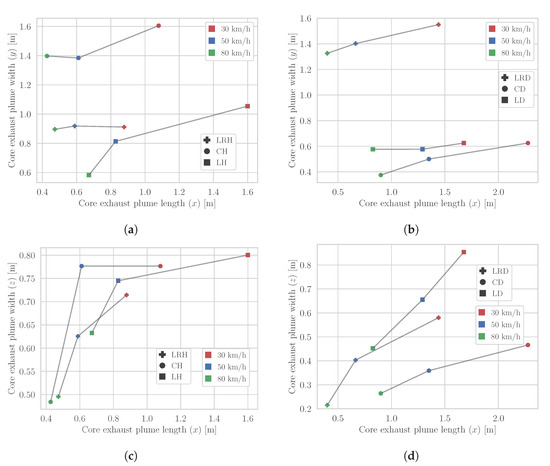 - Increasing vehicle velocities result in a decreased size of the core exhaust plume (CEP) in all directions.
