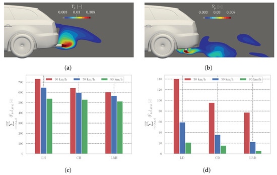 Figure 7a,d show the pollutant dispersion in the vehicle wake for a velocity of 50 km/h. The exhaust gases dilute very rapidly after they leave the tailpipe and enter the vehicle wake. To reach a hundredfold dilution of the exhaust tailpipe concentration, the exhaust plume has to be 0.83 m long (x), is 0.81 m wide (y), and 0.74 m high (z), as can be seen in Figure 7 and Figure 8a (for a vehicle velocity of 50 km/h with the LH tailpipe). Other vehicle velocities and exhaust tailpipe positions investigated are discussed in Section 3.2 and Section 3.3.