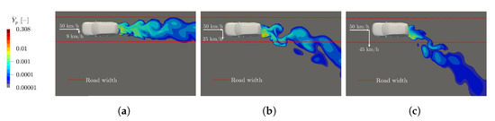 The contour plots of the flow velocity in Figure 4a,c clearly show the unsteady flow behavior in the vehicle wake, caused by continuous flow separation around the vehicle. The wake is thus geometrically determined by the height and width of the vehicle and equalizes with the undisturbed flow downstream. As discussed in Section 2, URANS simulations have the advantage of resolving the unsteadiness of the flow. Thus, a temporally variant velocity field was obtained as can be seen in Figure 4a,c. In contrast, Figure 4b shows a time-averaged velocity field. The unsteadiness is also evident in the evolution of the species concentration downstream of the vehicle as indicated in Figure 5. Therefore, measuring at different time instants results in slightly different species concentrations. For the sake of comparability, is used instead.