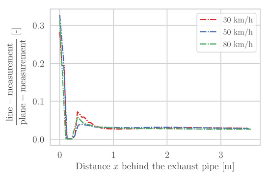 Consequently, unlike the technology based on the line-measurement principle, all local information of the exhaust plume is recorded in the vehicle wake, and thus the result of Equation (19) is what the plane-measurement instrument should theoretically measure. Since in RES the vehicle is moving while the measurement system is stationary at the roadside, 100 levels are taken in the simulation with a frequency of 200 Hz, over 0.5 s with increasing distance (according to the vehicle velocity) to the exhaust tailpipe. This way, the relative movement from the vehicle to the RES device is correctly represented. However, the URANS simulations performed show an unsteady flow behavior (see Figure 4a). Since these vortices influence the transport of the exhaust gases, a different dispersion behavior of the exhaust plume can be observed at different starting times of the procedure just described (see Figure 5 and related discussion).