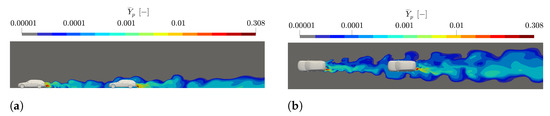 Pollutant mass fraction of two vehicles driven at 50 km/h, 10 m apart from the other, both with LH tailpipes. (a) -plane at -plane (tailpipe position), (b) -plane at -plane (tailpipe height).
