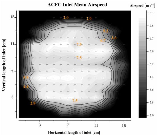 The distribution of airflow velocity measured under laboratory conditions. The panel shows the inlet flow field. Black dots of the cross indicate the points of measurement (mean of 10 values).