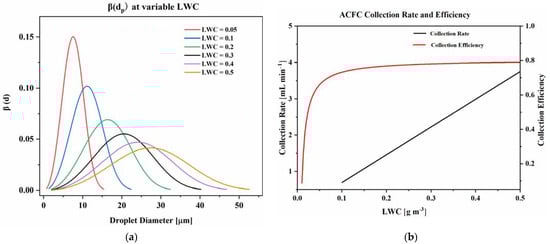 To obtain a more accurate assessment of collection efficiency, it is possible to calculate the theoretical droplet distributions and derive the overall collection efficiency for a given LWC value. For the assumption of theoretical droplet distributions, we used β(dp), a parameter representing the number of droplets per unit volume of a droplet over a specific diameter range, using the same approach as Demoz et al. (1996) [24], who used parameterizations presented by Best (1951) [29]. They defined the volume fraction of droplets with diameters between dp and dp + Δdp (in μm) as: