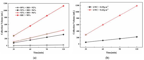 (a) The relationship between collection volume and duration of the sampler in different humidity ranges. (b) The relationship between collection volume and duration of the sampler at LWC = 0.25 g m−3 and LWC = 0.43 g m−3.