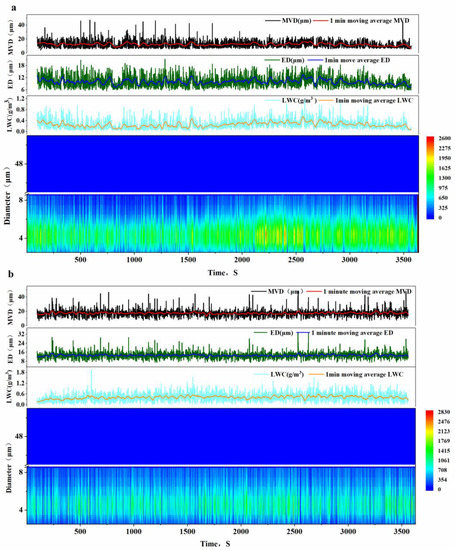 ED, MVD, LWC, and the relationship between Nc with fog droplet diameter at mean LWC of 0.25 g m−3 (a) and 0.43 g m−3 (b). Effective diameter (ED) represents the mean diameter of droplets, median volume diameter (MVD) represents the median diameter of droplets, and number concentration (Nc) represents the number of droplets in unit volume.