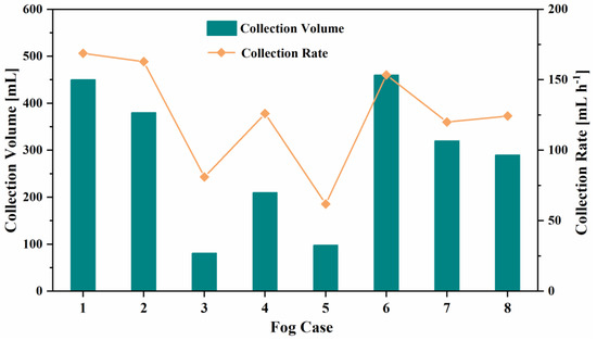 Although the value of LWC is subject to clear monitoring underestimation, the collection rate of 600 mL h−1 requires an LWC of 1.5 g m−3 based on Equation (4) introduced in Section 3.2. This also indicates that the ACFC has a high collection efficiency in high-moisture-content fog. Due to the limitation of the ultrasonic oscillation frequency of the humidifier, which results in droplet diameters being more than 90% distributed below 5 μm, the monitoring value of FM-120 on the LWC was underestimated. Therefore, the experiment only conducted the fog droplet sampling experiment under the condition of high LWC levels (LWC > 0.2 g m−3) and used FM-120 to conduct real-time monitoring of the physical parameters of the fog droplet.