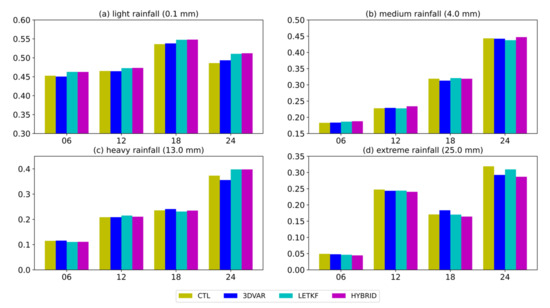 Quantitative precipitation forecast validation was performed by calculating TS values to identify the influences of the 3DVAR, LETKF, and HYBRID schemes. Figure 8 shows the 24 h temporal evolution of the TS values for the 6 h accumulated precipitation forecasts of the different experiments. In general, the assimilation of AMVs positively impacted the short-range rainfall forecasts. In terms of light rainfall (Figure 8a, up to 0.1 mm), the scores obtained for the assimilation experiments were higher than those obtained for the CTL experiment, and the TS scores determined via the HYBRID experiment were always higher than those determined via the LETKF and 3DVAR experiments. Regarding medium rainfall (Figure 8b, 0.l–4.0 mm), the HYBRID experiment yielded the maximum TS values at 06, 12, and 24 h relative to the other three experiments. At 18 h, the TS values for all assimilation experiments were lower than those for the CTL experiment. Regarding heavy rainfall (Figure 8c, 4.0–13.0 mm), the 3DVAR experiment generated the maximum scores at 06 and 18 h, while the LETKF experiment generated the minimum scores. However, at 12 and 24 h, the LETKF experiment yielded the maximum scores, while the 3DVAR experiment yielded the minimum scores. The HYBRID experiment always produced moderate TS values that varied between those for the 3DVAR and LETKF experiments. Regarding extreme rainfall (Figure 8c, 13.0–25.0 mm), improvements could hardly be achieved in the assimilation experiments, and both the 3DVAR and LETKF experiments exhibited lower TS values than those for the CTL experiment most of the time. As a result, the HYBRID experiment exhibited the minimum TS values. Overall, the HYBRID scheme could improve the forecast skill for light and medium rainfall, which was partially due to the position accuracy of TC track prediction. Regarding heavy rainfall, the HYBRID scheme could partly offset the negative effects of the LETKF or 3DVAR scheme and exhibited moderate TS values. However, for extreme rainfall, due to the negative effects of both the 3DVAR and LETKF schemes, the HYBRID experiment yielded the minimum TS values.