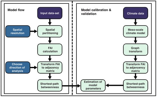 In this section, we develop the methodology for our wind corridor analysis. We are interested in finding likely air flow corridors based on the premise that wind across a city follows the path of least resistance [5]. This logic corresponds to computing the LCP, which finds the path of least resistance across a cost trajectory from a source point (SP) to a destination point (DP). By defining multiple SPs and DPs, we can find pathways that represent routes with strong ventilation potential and a high degree of connectivity. These are called wind corridors. Since we are considering multiple SPs and DPs, we need to define a metric that quantifies the contribution of each spatial location to the overall ventilation potential. Once such metric is known as the betweenness centrality of the LCPs. The shortest path betweenness centrality is a well-known metric in graph theory and has many applications in network theory [31]. A graphical representation of our framework is depicted in Figure 1, where the left panel is the wind corridor model and the right panel depicts the calibration of the model, which is presented in Section 3. Our approach is based on the following four steps: