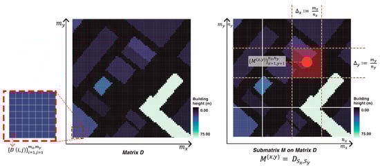 - Input dataset: given a 3D dataset that contains the buildings footprint (coverage) and respective heights inside the domain (e.g., Singapore), the dataset is represented by a matrix with rows, columns, and non-negative values (since the heights cannot be negative). Each entry in provides the height of the building at that spatial location (pixel) and is denoted by . In the case where a pixel does not contain a building, its value is zero.
