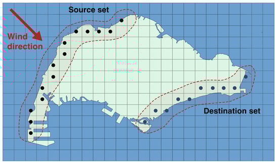 To complete the specification of the LCP analysis, the sets of source points and destination points need to be determined. These sets depend on the direction of analysis, such that the set of source points is located along the boundaries of the domain that is aligned with the direction . The set of destination points is located also along the boundaries of the domain, aligned with direction , but from the other side; see Figure 6 for illustration for the case .