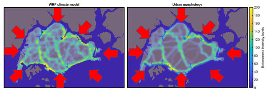 Wind plays an important role in city climatology due to its relevance for urban ventilation and transport processes, such as heat and pollutant transport [1]. Thus, understanding how to design urban ventilation patterns in order to improve wind flow is one of the key strategies for achieving good air quality [2,3], Urban Heat Island (UHI) mitigation [4,5], and Outdoor Thermal Comfort (OTC) [6,7], especially in densely-built urban areas. Such a relationship was further established in the studies by [8,9], where an association between area-level urban air ventilation and human health and mortality was made. Another important aspect is the use of wind as a clear source of energy that can reduce environmental emissions and energy costs, see [10]. Improving wind flow within the urban environment can assist in harvesting more renewable energy and should therefore be encouraged. The general pattern of wind in the city tends to be lower than in the suburban or rural areas, as a result of the aerodynamic response of wind to the urban structural form or morphology [11]. Buildings dominate the morphology of the city and also exert the largest resistance on air mass, which consequently reduces its velocity and compromises its ability to ventilate the urban canyon [12]. In the past, a lot of research has identified which urban parameters could best represent this building–airflow interaction [13,14] and has used these parameters to map the likely wind paths across the city [15].